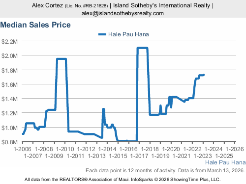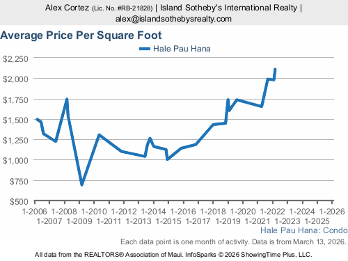 Below please view a chart detailing the average price per square foot and inventory levels at Hale Pau Hana. The biggest issue in trying to discern market conditions at HPH is the lack of consistent inventory. Contact us for context and more information regarding current Kihei real estate market conditions.